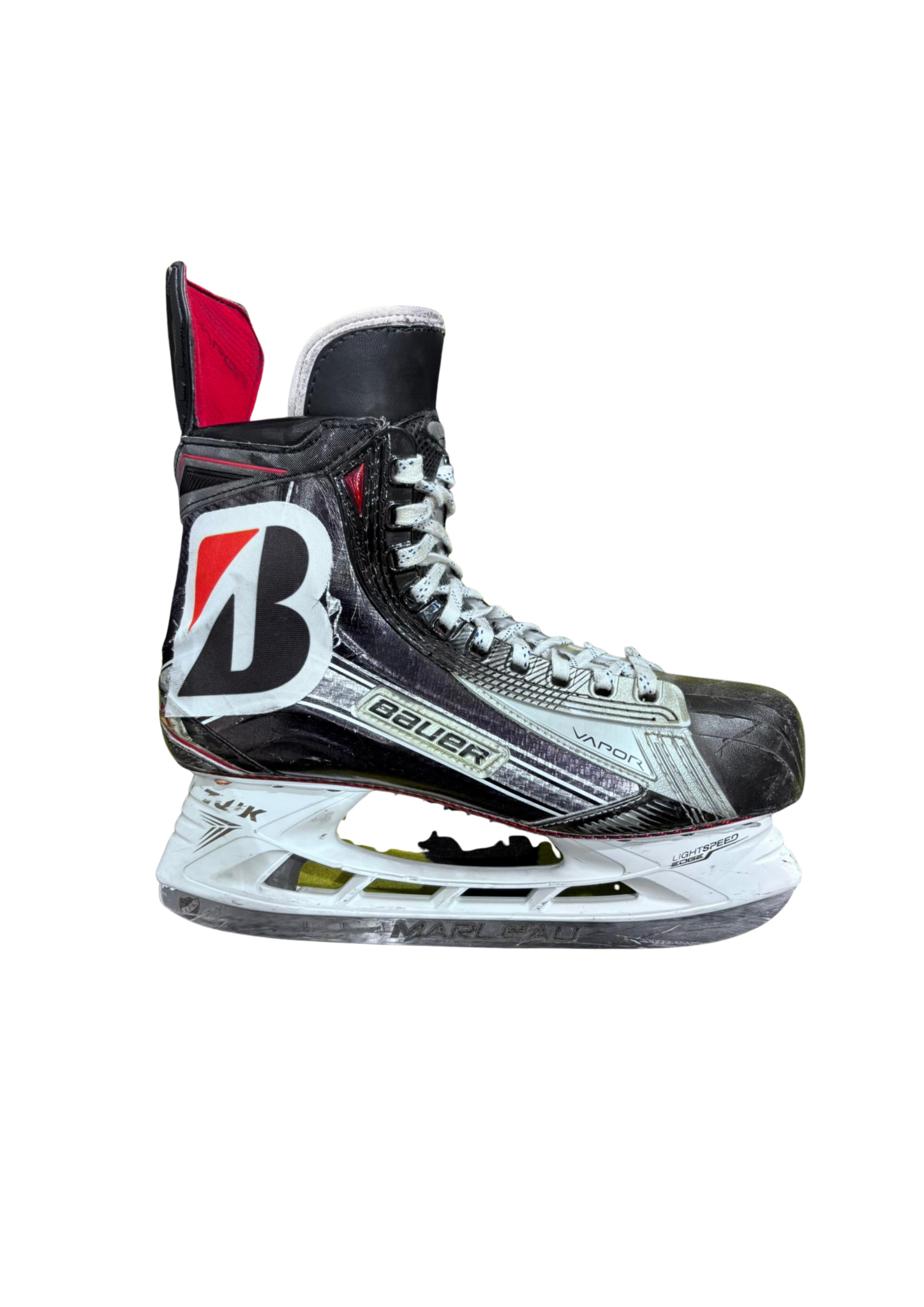 HIFK:n Liiga-joukkueen käytössä olleet Bauer Vapor 1X Custom -luistimet koossa 11. Vapor-sarja tunnetaan keveydestään ja räjähtävästä luistelutuntumasta mikä sopii erityisesti nopeaan ja aggressiiviseen pelityyliin. Custom-rakenne tuo istuvuuteen yksilöllisiä ratkaisuja jotka eroavat selvästi vakio-malleista.