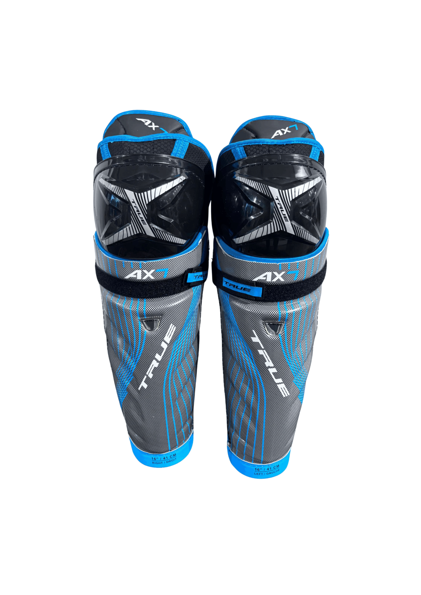 True AX7 -polvisuojat koossa 16”. Nämä laadukkaat suojat tarjoavat erinomaisen istuvuuden ja hyvän liikkuvuuden, ja ne soveltuvat aktiiviselle pelaajalle, joka haluaa modernit ja kevyet polvisuojat jäällä liikkumiseen.